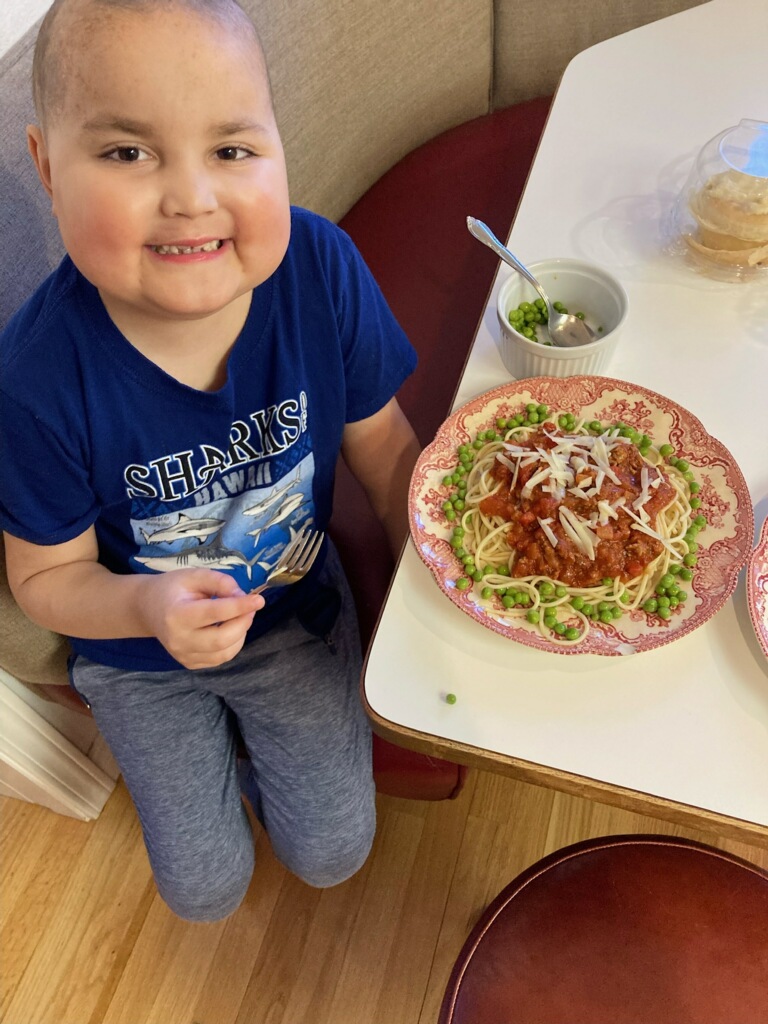 happy as a clam, eating clamsTheo calls this one the “Chupi Bowl” with rice, chicken broccoli, and carrots.Mormor’s famous spaghetti… with peas?