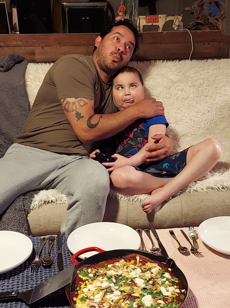Me. Blogging in the backyard.Chef papa and chef Theo making enchiladas for dinner.