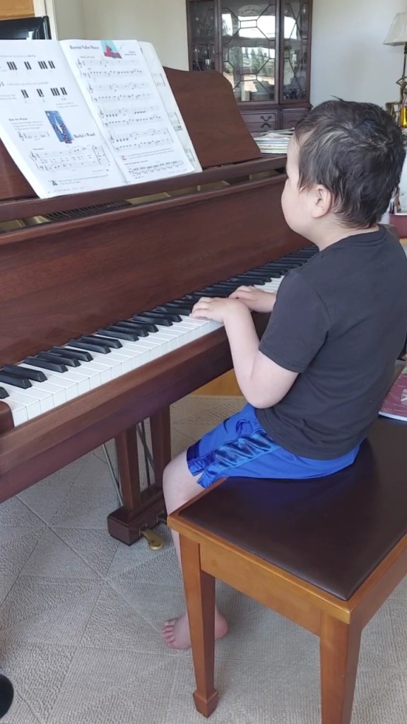 Practicing the piano so he can play his favorite song at the recital coming up.