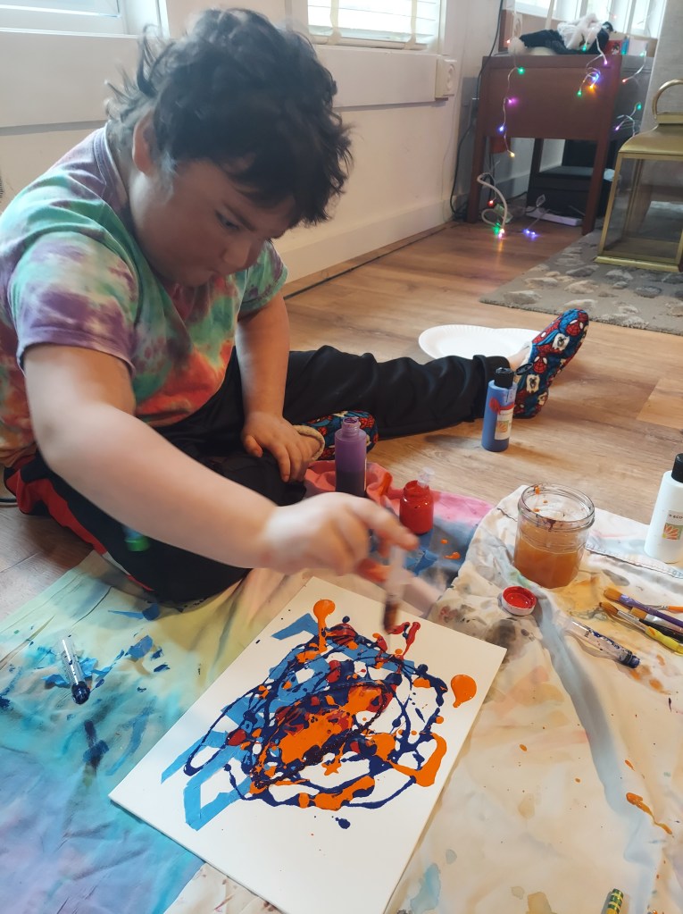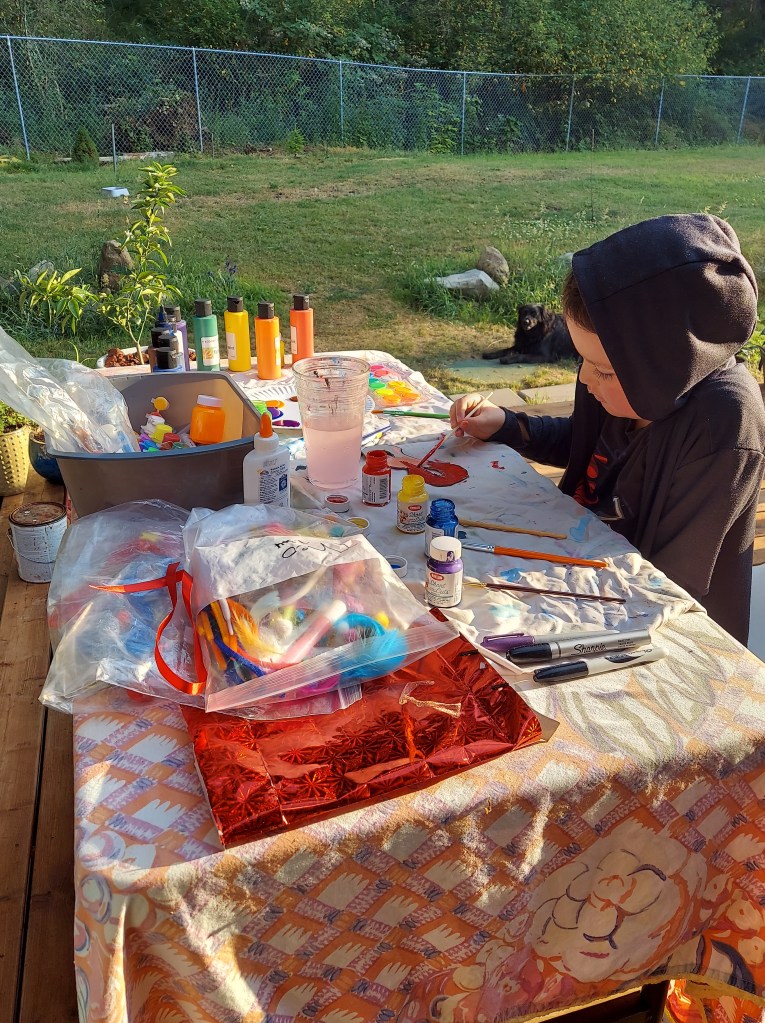 So, what do we do? We take it one meal, one moment, one bite at a time. We go outside for a break. Smell the fresh air, listen to the birds, or take a nature walk. There’s always something new to discover and enjoy outside. We talk about our struggles and frustrations openly. We listen. We remind each other to breathe. We do our BEST. And lastly, we remind ourselves that this is temporary!! This is not normal. We will get through this like so many other hard things we’ve been through. And when Theo needs another distraction? Reading and Art. The perfect distraction for him. If Theo is not eating, he is reading or drawing or painting. He reads books like he eats popcorn: daily and fast. He can sit for hours working on a project and not think or talk about food. Theo puts on his headphones, turns up the music, and starts creating. He is in the zone. Ideas flowing, music jamming, and then he is the one floating on another planet, lost and relaxed. No stress, no cravings, no breakdowns. Just a boy in his own world.
