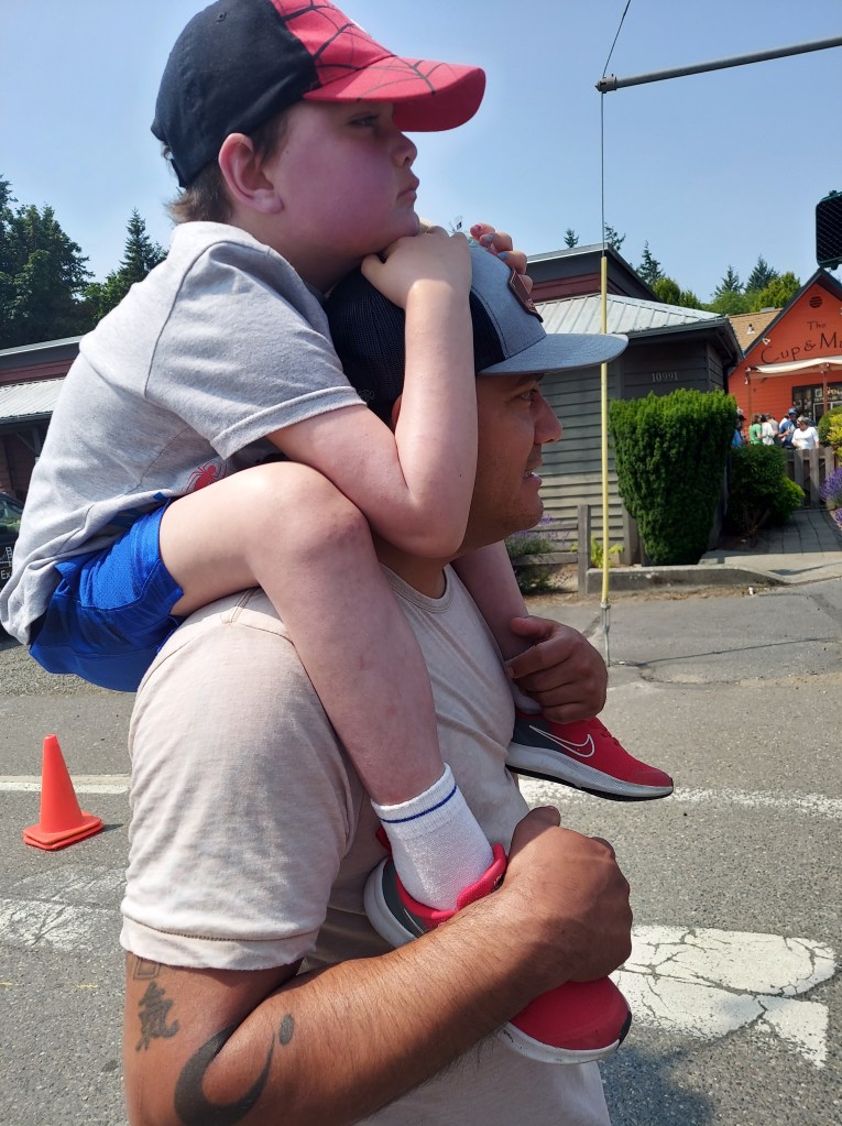 Feeling slow on the 4th of July, Theo gets a ride on Papa’s shoulders.
