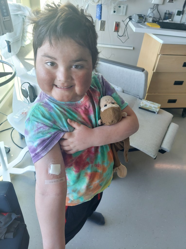 Then GVHD came back with a vengeance. In my last update, Theo was currently taking 30mg of prednisone (1 mg per kg of weight) per day. For the past six weeks (since I last wrote) his liver enzymes (ALT) have been going up and down like a yo-yo. Our weekly visits to Seattle Children’s Hospital turned into twice weekly to check labs and liver inflammation. We were not moving in the direction we wanted. On Thursday, July 20th, Theo’s ALT dropped slightly from the 600s into the 400s after the increase in prednisone to 30mg. With the improvement in inflammation, Theo’s doctor felt it would be safe to start an antifungal medication called, Posaconazole. It has a reputation for causing liver irritation, but with the increased steroid dose, there was a chance Theo’s liver could handle it. On Monday, July 24th, we went back to the clinic for a blood test. It wasn’t good. The ALT was back UP! Theo could not continue taking Posaconazole. The only anti-fungal medication that doesn’t irritate the liver is Micafungin, which is only available in IV form. The following Friday, July 28th, Theo had a peripherally inserted central catheter (PICC) line surgically placed in his right arm. And just like that, we were back to daily flushing of the line, daily infusions of Micafungin at home, no baths – only showers with aqua guard, and carrying medical supplies with us everywhere we go. Not again! I’ll be honest. I was completely agitated and fearful about what was happening but doing my best to not let it show. As usual, Theo kept a positive attitude. He kept reminding us over and over, “this is only temporary”. Surely the liver would recover soon… right?!