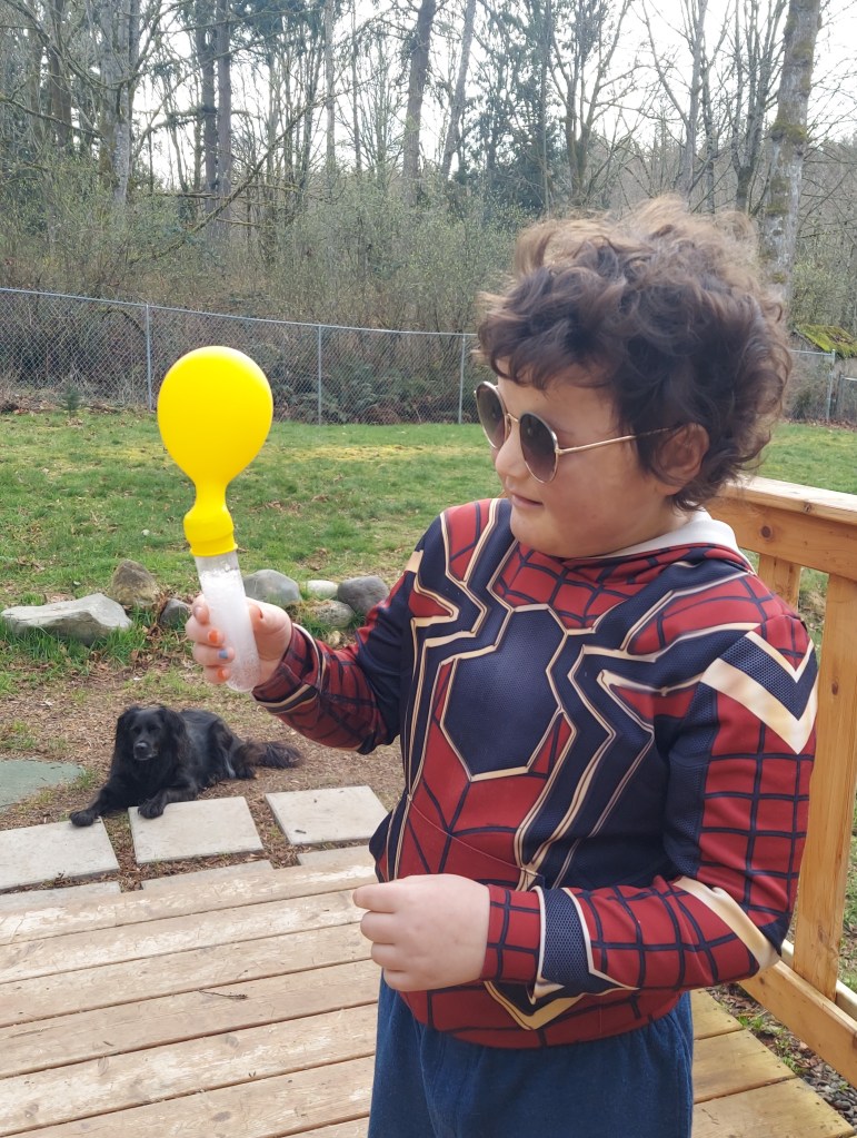 Balloon blow up experiment with assistant Manu watching from a safe distance.