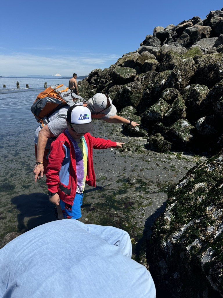 Cool dude searching for sand dollars. We found 16!Low tide exploring with friends and sea scholars. We watched a seagull swallow a starfish whole!