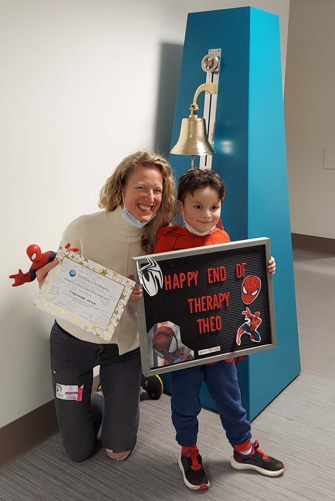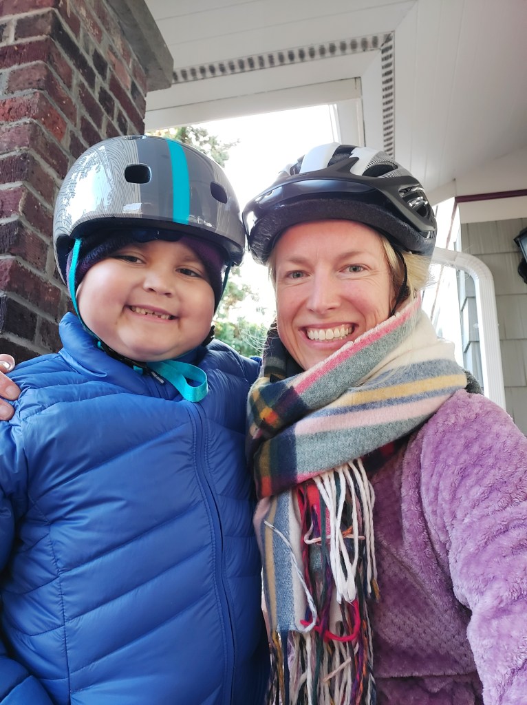 Today is day 73 post-transplant!! Theo has been out of the hospital for just over one month. The first couple of weeks out of the hospital were tough. But I think we finally found our groove. We have a well-established routine and Theo’s energy is climbing fast. Leaving the hospital, Theo needed a wheelchair to get around. He was so tired all the time, so exhausted he could not stand up for more than 10 minutes. The first two clinic appointments he could barely keep his eyes open. One week after discharge, an anti-nausea medication that causes drowsiness, called olanzapine, was removed from his nighttime routine. Theo’s energy immediately showed improvement. A few days later, Lorazepam, another sedative, was removed. BOOM! The lights came back on, and Theo was awake again!! Good-bye and good riddance to you, Mr. wheelchair! Oh, what a difference. It’s like Theo had been under a spell, in this loopy sleepy haze for so long. Presently, Theo stretches every morning, takes a walk with me at least once a day, is dominating his physical therapy appointments twice a week, walking upstairs unassisted, and… (drum roll) riding his bike!! What an amazing accomplishment. I couldn’t believe it. It was a beautiful sunny crisp cold day last week, and Theo decided that he wanted us to ride our bikes along the Burke Gilman trail and stop somewhere for lunch. It was SO FUN and I was SO PROUD I couldn’t stop smiling. Theo does whatever he sets his mind to. He is focused and motivated to get healthy and strong. Theo is also incredibly aware and observant of what’s going on around him. He is not shy to speak up and correct me or a nurse if we say something that is inaccurate. Even when you think he is not paying attention, he is. He may look like he’s sleeping, but oh no. Don’t be fooled. He is listening and hears everything. He knows how to pronounce all the names of his medications. If he hears someone mispronounce a medication, he quickly corrects them. Like Dexrazoxane. Try saying that. It’s not so easy, is it? He knows he is my angel, my sweet boy. But he is also my strong warrior and teacher. He reminds me to take deep breathes, to set a daily goal, to not speak while chewing my food, and to not use words like “hate” or “stupid”. In many ways, Theo is also my caregiver. When it’s time to turn off the light and go to sleep, Theo pats me on the shoulder and says quietly, leaning towards my ear, “if you need anything, I’m right here”.