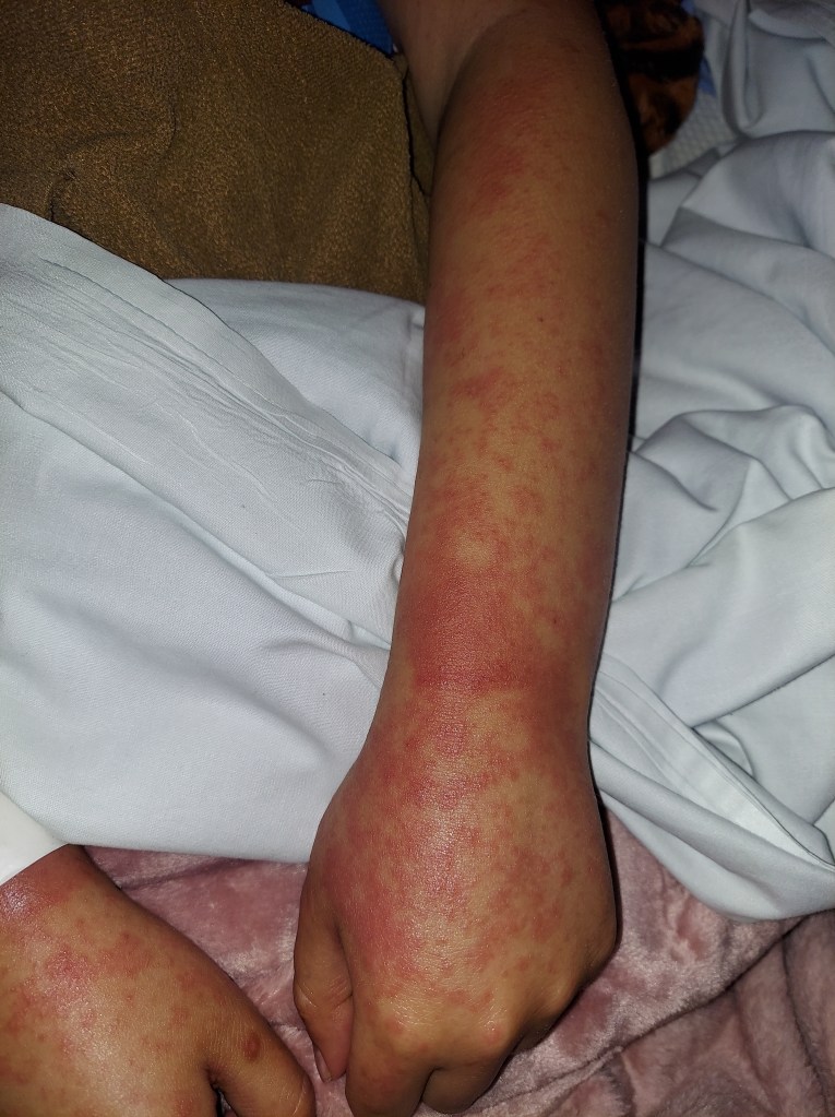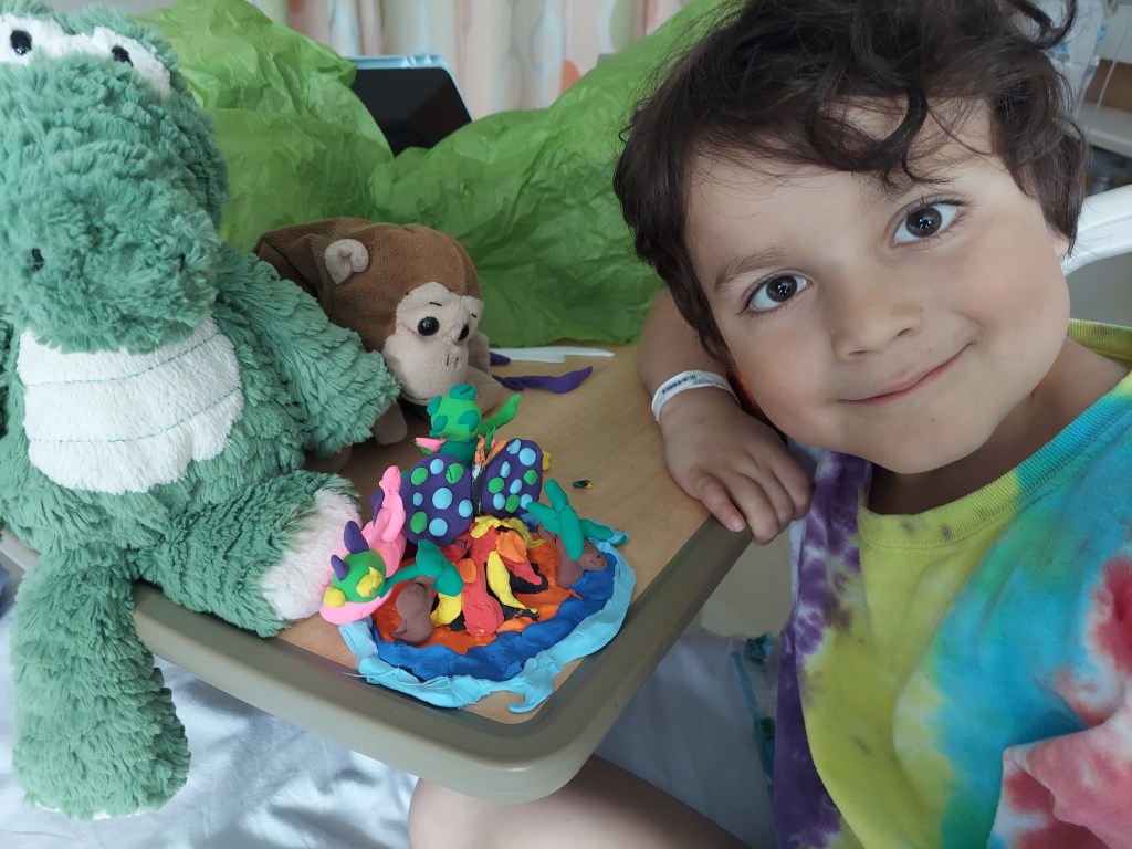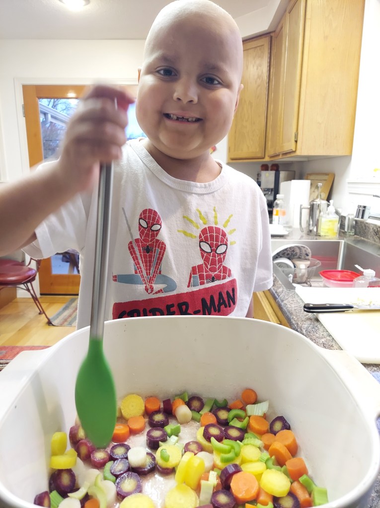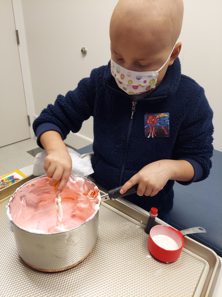 All of this delicious food and extra love has added 11 pounds to Theo’s frame. The doctors are not at all concerned about his weight gain. In fact, they are pleased to see him eating and drinking so well. It is much better for Theo to be above weight while he recovers rather than underweight. It’s only a problem when I have to pick him up to carry him upstairs! By back, ouch! The steroids will end, but it takes time. The dose is slowly being tapered down over months. Steroids cannot be stopped abruptly. It has to be a slow process. It’s a fine balance of calming down the new cells so they stop attacking their new home, but not so much that they stop growing and being active. Like baking a cake. You need just the right temperature and time, so the toothpick comes out clean. We are looking forward to the end of steroids. Not just so Theo can get back to more regular eating habits, but also so he can sleep well again. Steroids make it hard for him to sleep. He wakes up constantly with the need to have his legs stretched or because he is “uncomfortable”. The steroids were originally scheduled to stop at the end of this month. Unfortunately, the dose was recently bumped back up. Theo broke out in a rash all over his chest and back about one week ago, a sign of GVHD returning. He wakes up often, feeling itchy and needing lotion several times a night. Triamcinolone ointment is applied to his entire body three times a day in attempt to calm the rash. For now, it is mild and will hopefully go away with the topical steroid ointment. If it gets worse, the course of steroids and taper will start all over again. Apparently, it is not uncommon for this to happen. In fact, it is expected to see some GVHD in patients post-transplant within the first 100 days. GVHD can come back many times while the new cells are getting used to their new home. The good thing about MILD GVHD is that we know the cells are strong and active. It’s a positive sign that Theo’s new immune system is up and running!