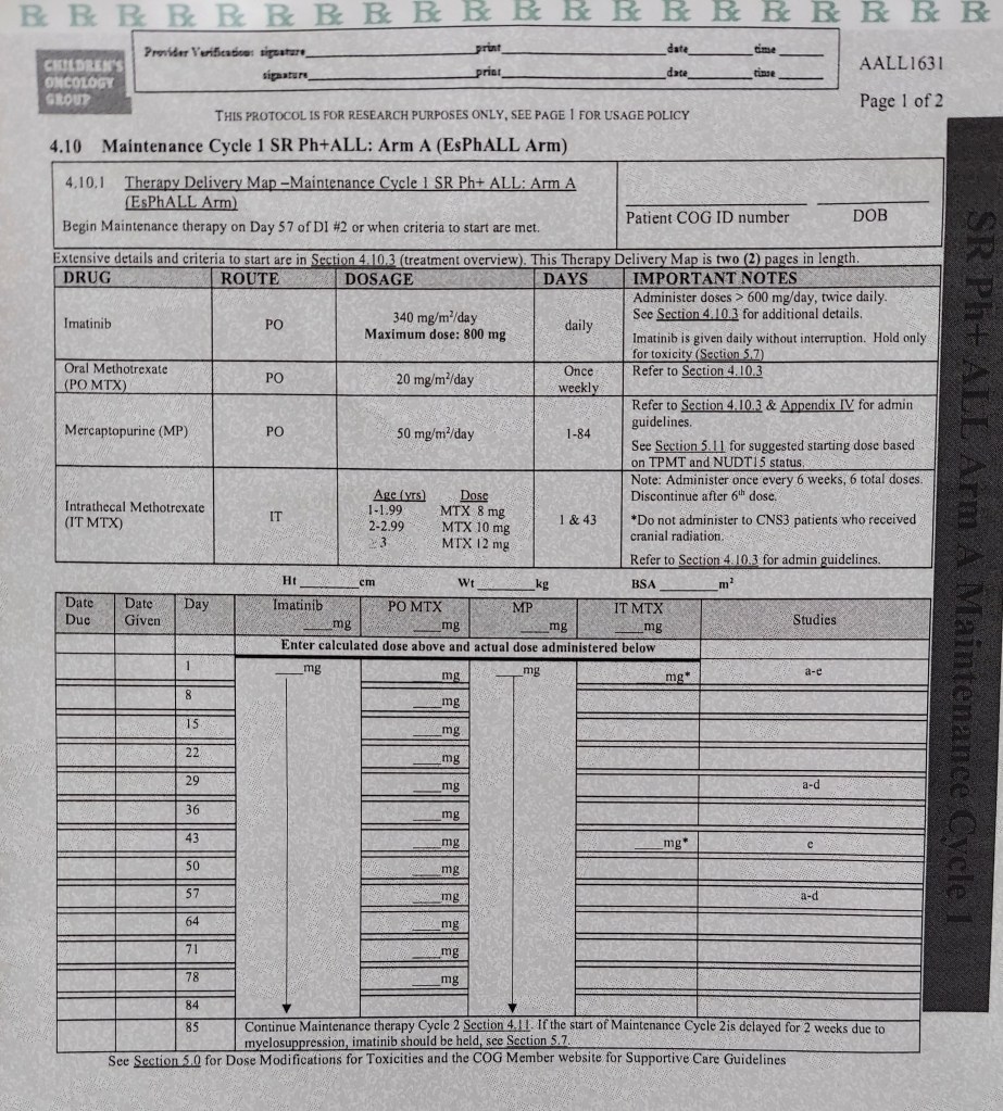 Remember Interim Maintenance? It was the easy phase before Delayed Intensification #2. Well, guess what? Maintenance is almost exactly the same! He takes all of his chemotherapy at home, orally. He will continue to take Imatinib daily, as well as Mercaptopurine. Oral Methotrexate is taken once a week. Every six weeks he will get a back poke of Intathecal Methotrexate for a total of six doses, which Theo is obviously excited about. Maintenance is divided into four cycles, each course lasting three months. The only change happens in the fourth cycle, when Theo does not get any back pokes. Otherwise there are no changes in his medications. Last but not least is Bactrim – not listed on the therapy delivery map. Taken since day one, it is an antibiotic taken every Monday and Tuesday for the duration of his treatment and three months following the end of therapy to prevent pneumocystis pneumonia. Now to answer the burning question: how long does Maintenance last?????