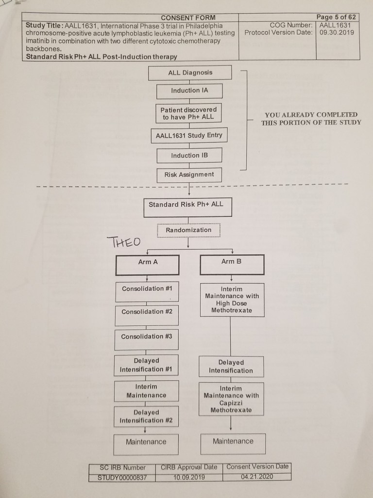 When in doubt, refer to a flow chart. This chart shows the phases that Theo has already completed and the phases that are to come. The MRD came back less the 0.05%, which means he goes to the “standard risk” arm of treatment. Within that arm, there is Arm A and Arm B. Great, another fork in the road. “Now which way do we go?” Asks Dorothy. Luckily we don’t need to depend on a scarecrow’s advice to figure out which direction we are going. We got our answer from a clinical study. Let me tell you why. When this all started, when Theo was first admitted to the ICU, we met with a very large team of specialists assigned to Theo’s case: doctors, researchers, fellows, nurses, you name it. Again, it was all such a blur at the time I rarely knew who was who or what they were talking about. We were told that treatment planning heavily relies on results from clinical studies. In other words, experimental studies are needed to help figure out the best way to treat patients with leukemia. We were asked to participate in a clinical study and we said YES. We believe that if we can help doctors and researchers find a better way to treat leukemia then we should do it. It plays a huge roll in the advancement of medicine. It is why Theo can be treated so effectively today and eventually cured. It is why there is a drug, Imatinib, that works to kill the Philadelphia chromosome… because 15 years ago, it did’t exist. So, back to the flow chart. The fork represents the clinical study. The purpose of the clinical study is to find out if extra chemotherapy is needed. Is the addition of the Imatinib drug enough to kill the Philadephia chromosome-positive leukemia cells? OR is a higher intensity chemotherapy regimen needed as well? Arm A is the standard treatment: higher intense chemotherpay with Imatinib. Arm B is the experimental arm: less intense chemotherapy with Imatinib. Theo was assigned to Arm A. Now can you see why I love this blog? There is no way I could explain this every time I was asked, “What’s next?”